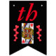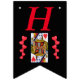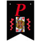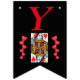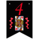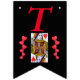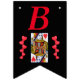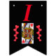 Esta bandeira em forma de banner de beliche Feliz Aniversário é preta com uma rainha do coração ornamentado tocando cartas com filas de corações vermelhos em cada lado da carta. Personalize o ano de aniversário com os modelos.