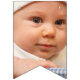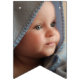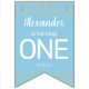 Bandeiras de primeira festa de aniversário de bebê apresentando imagens dos últimos 12 meses, e 4 bandeiras azuis com brilho de ouro, nome, idade e data.
