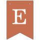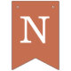 Uma simples bandeira de bunting para um casamento de terracotta, com os nomes da noiva e do noivo, com bonés brancos em fundo marrom terra cotta.