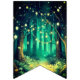 A beautiful evening for a wedding, with a forest path adorned with fairy lights in the trees creating a stunning backdrop. A gentle mist lingers in the background of the forest, with countless trees and lights hanging gracefully from their branches.