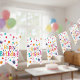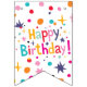 Este design de bandeira de bunting apresenta uma alegre saudação "Feliz Aniversário!" em um estilo divertido e nostálgico, com uma variedade de cores vibrantes. O fundo branco é coberto por uma mistura lúdica de pontos multicoloridos e explosões de estrelas retrô que parecem confetes jogados. Com sua forma triangular clássica e tons brilhantes de azul-turquesa, rosa, laranja e roxo, esta bandeira adiciona um visual de alta energia a qualquer espaço de festa. Ela captura um clima simples e vintage de meados do século que funciona perfeitamente para uma celebração festiva. Essas bandeiras são uma ótima maneira de trazer um toque de cor e um clima de festa clássico para suas paredes ou portas.