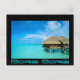 Cartão postal com um bangalô sobre-água na lua de mel num resort de luxo na clara lagoa azul da ilha pacífica de Bora Bora, perto do Tahiti no arquipélago francês da Polinésia. com com. com