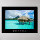 Poster de um bungalow de lua de mel superd'água e telhado, num resort na lagoa turquesa clara da ilha tropical Bora Bora, tendo em vista o Monte Otemanu, perto do Tahiti, na Polinésia Francesa, com uma fronteira negra, e o texto: "Bora Bora". decoração de excelente na sua parede!
