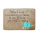 Um tapete de banho engraçado que diz: "O que mais amo em minha casa é com quem compartilho meus peidos." fundo de madeira com coração e arte de pássaros.