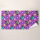 Uma toalha de banho com um padrão de cinza e de feltro bonito e colorido contra um fundo violeta púrpura com sotaques de bolinhas multicolores.