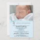 Um convite bonito do baptismo ou do batismo do bebê com um fundo e uma cruz textured azuis, assim como um encanto transversal azul bonito da fita e da prata de organza.
