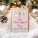 Festa natalícia de Nutcracker, placa de bar de chocolate quente com estrelas douradas e fundo rosa.