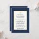 Um convite para o Bar na moda Mitzvah com uma borda azul escura com um efeito sutil de textura aplicado. A área de texto é branca, cortada em ouro e acentuada por uma estrela dourada de David e uma flor de ouro ornamental. O dorso é azul escuro.