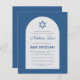 Um convite para bar de orçamento. Em um fundo azul clássico, ele tem um arco branco com dentro de texto azul. O nome é escrito em um roteiro caligráfico elegante. Acima do texto há uma estrela azul de David.