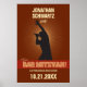 Ele é a estrela do rock. Faça do Bar Mitzvah um show para se lembrar. Este poster dá o tom para a festa. É excelente como uma decoração por conta própria, pendurada na sala. Ou usá-lo como alternativo de um livro de entrada: tenha um marcador prateado/metálico por perto e encoraje as pessoas a escrever em seus próprios desejos! Versões menores fazem excelentes e favoritos para festas. Este poster coloca sua estrela de rock em destaque. O nome dele está no letreiro e ele está vivo! Uma silhueta - representando seu filho - segura um microfone com a mão levantada triunfantemente no ar. Você pode personalizar praticamente todas as informações impressas com o nome do seu filho e a data do evento... basta preencher os campos!