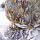 Um design fotográfico da maré marinha se lavando na praia e rochas, expondo as algas e os lagoas.