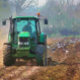Preparando-se para a próxima colheita. O trator ara o campo e os pássaros selvagens procuram comida no solo recém-revolvido. Aquarela Inglaterra.