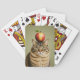 Gato engraçado com uma maçã balançando em cima de sua cabeça.