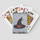 Este baralho de cartas tem um chapéu preto de bruxa com estrelas e faixa laranja, uma fivela prateada e uma aranha fofa pendurada na ponta do chapéu. O fundo é um olhar pintado branco sobre o preto com pequenas estrelas pretas.
