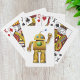 Robôs podem ser amigáveis como esta design prova. Este design é um robô amigável que está parado e acenando. O robô é dourado e tem um botão verde no peito e olhos verdes. Este design de robô amigável parece excelente nessas cartas de jogar. Perfeito para si mesmo ou como presente