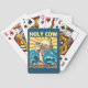 Uma vaca engraçada jogando cartas. Use "Personalizar este modelo" para alterar o texto do CLUBE "HOLY COW POKER" e criar uma mensagem personalizada exclusiva. Cartões com uma piada visual com uma vaca dramática em um roupão, segurando um tostão e um pergaminho religioso de pastor, partando ondas com um ouro por trás do sol.