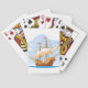 This is a cartoon-style illustration of a large, wooden galleon sailing on blue water under a light blue sky with white clouds. The ship has multiple masts with billowing white sails and two red flags flying at the top. The wooden structure of the ship is detailed with visible planks and portholes. The overall style is cheerful and simplified, suggesting a storybook or animated depiction of a historical sailing vessel. It evokes a sense of adventure and exploration on the sea.