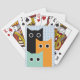Cartões de jogo adoráveis com três gatos engraçados. Um é preto, à esquerda do design, outro é laranja, ligeiramente inferior e à direita do gato preto, ligeiramente à sua frente e outro é lacrado, inferior aos outros dois gatos e parado à sua frente. A única característica nos gatos é grande olhos redondos. O fundo das cartas é um padrão de gingham azul pastel bonito.