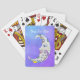 Este baralho de cartas tem uma lua mística branca em forma de crescente com um rosto e marcas coloridas de abstrato em azul, amarelo e roxo juntamente com três estrelas sobre um fundo do céu roxo com estrelas minúsculas. Personalize seu texto com o modelo.