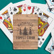 Cartões de jogar à cabana russa personalizados, com um desenho paisagístico de árvores, sobre um fundo de madeira marrom, personalizados com a NOME FAMILY CABIN e o Ano Estabelecido. ASSISTÊNCIA: para obter ajuda com a modificação ou personalização do design, alteração de cor, redimensionamento ou transferência do design para outro produto, entre em contato com o designer ANTES DE ENCOMENDAR através da guia MENSAGEM de Bate-papo Zazzle abaixo ou envie um email para makeitaboutyoustore@gmail.com.