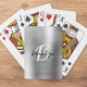 Esses elegantes cartões personalizados de jogar apresentam um monograma e primeiro nome em modernos roteiros preto e branco em um fundo de metal esfregado fino de prata.