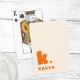 Tocando cartões com o seu monograma inicial em uma fonte grande, em negrito e com o seu nome abaixo. Texto laranja sobre fundo mais leve. As cores são personalizáveis na ferramenta design.