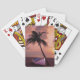 Matizes suaves de pinks e céu alaranjado com barco de pesca de madeira sob uma palmeira.