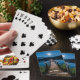 Jogando cartas com uma bela fotografia de um píer de madeira esticado sobre um lago calmo. O céu noturno coberto de estrelas e uma bela lua de cheio.