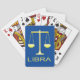 Este incrível baralho apresenta uma imagem de arte digital de um par de balanças coloridas em ouro com a palavra Libra em texto dourado. Um design divertido para pessoas celebrando um nascer de aniversário entre 23 de setembro e 22 de outubro, sob o signo estelar de Libra.