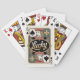 This poker card deck features a playing card design with Lucky in gold script lettering on a black oval medallion. The card is a six of spades, with the number 6 and suit symbol in black at the corners. The design has Art Nouveau and Art Deco elements in a symmetrical layout. The central medallion has decorative gold borders. Two symmetrical faces are on the left and the right in a vintage illustration style with hair and beards. The background features a geometric pattern with spade and clover symbols in teal and gold. The card deck contains 52 cards plus 2 jokers. The cards are easy to shuffle. These cards would be good gifts for poker players and art lovers.