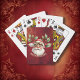 Um Papai Noel galopado com um fundo vermelho profundo adornada com folhas e bagas ocas. Os papais noeis vestem um chapéu vermelho com um caimento branco e um par de óculos estilo steampunk com sotaques de ouro. Sua barba branca e bochechas rosadas acrescentam sua aparência alegre. As palavras "MERRY CHRISTMAS" são escritas em caracteres decorativos na parte inferior da imagem.