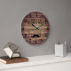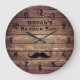 Barber Compra Large Clock com imagem de bigode e nome comercial personalizado numa cor de fundo de madeira rústica.