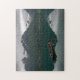 Quebra-cabeça de serra de vaivém de uma paisagem com um barco a remos velho em um lago com a reflexão das montanhas na água imóvel, Hjelle, Noruega.