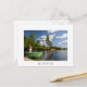 Cartão postal de um pequeno barco verde e de uma cabana de madeira com algumas árvores altas à beira da água numa paisagem de fiorde em Byglandsfjord, Noruega com uma fronteira branca e o texto: "Noruega".