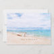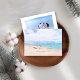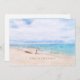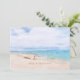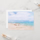 "Seas 'N Saudações" citação na areia da praia para o feriado de Natal. Captivando um barco de pesca preguiçoso em uma praia arenosa com aqua azul-oceano aqua e céu ensolarado acima. Modelos de fotos e texto no verso.