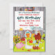 Personalize esta modelo festa de aniversário com os detalhes do seu próprio partido. Apresenta um tema bonito de animais da fazenda de Barnyard com um fundo de madeira estampada. Tem um cavalo colorido e engraçado, galinha, galinha, vaca, porco, cabra, ganso, celeiro, moinho de vento, pomar de maçã, sol e flores. A madeira do celeiro é apenas um design impresso.