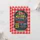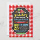 Cultive o convite do primeiro aniversario com xadrez vermelha, tratores vermelhos, um celeiro e uns animais de fazenda bonitos, um cavalo, porco, vaca, galinha e pato.