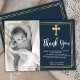 Simples, elegante batismo azul-marinho e batismo, obrigado cartas. Envie obrigados para a família e amigos com este obrigado personalizado moderno, seu cartão plano religioso. Ele apresenta o script "Obrigado", com letra manuscrita, em torno de dois quadros de folhas de ouro falsos em fundo de marinho. Este belo cartões de agradecimentos fotográfico moderno também será perfeito para batismo / batizar / batizar cerimônia / confirmação e cartões de agradecimentos de comunhão sagrado para garotos ou meninas. 3354