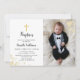 Este Convite para Batismo de Meninos Elegantes apresenta lavagens de ouros, faixas pretas e brancas e fontes elegantes. O reverso deste convite são faixas de preto e branco. Este convite elegante é perfeito para a celebração clássica do batismo. Aproveite!