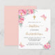 Um fundo branco decorado com flores e borboletas cor-de-rosa. Personalize e o nome e os detalhes da cerimônia. Letras pretas e ouros coloridas. Traseira: cor de fundo embaçada.