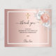 Um cartões de agradecimentos elegante com foto. Um fundo metálico rosa dourado, uma armação branca, rosas de ouro rosa, florais. Uma cruz ouro. Personalize e adicione uma nota de agradecimento, foto da menina e nome. Texto preto.