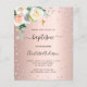Um fundo metálico de rosa dourado falso, decorado com flores em diamantes brancos, rosados e falsos. Personalize e o nome e os detalhes da cerimônia. Letras pretas coloridas.