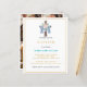 Convite personalizado para batismo com colagem personalizada de fotos. Rosas florais modernos, com tecido azul, encheram a cruz de madeira na frente com pormenores do convite a seguir apresentado. Um convite para o batismo moderno e elegante para o seu bebê.