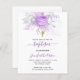 Para um batismo elegante, comemorando uma menina. Um fundo branco chic. Decorados com flores roxas e brancas, rosas e uma cruz de ouro falsa. Personalize e adicione o nome da criança e os detalhes. Letras pretas e ouros.