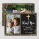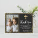 Simples, elegante, Dourado e batismo negro e batismo, obrigado cartas. Envie obrigados para a família e amigos com este obrigado personalizado moderno, seu cartão plano religioso. Ele apresenta o script "Obrigado", escrito à mão, em torno de dois faux gold foil frame e gold glitter confetti em fundo preto. Este belo cartões de agradecimentos fotográfico moderno também será perfeito para batismo / batizar / batizar cerimônia / confirmação e cartões de agradecimentos de comunhão sagrado para garotos ou meninas. 3354
