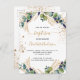 Um fundo branco decorado com verde de eucalipto e folhas de ouro e gotas falsas de ouro. Personalize e o nome e os detalhes da cerimônia. Letras pretas e ouros coloridas. Traseira: fundo branco com gotas de brilho inverso do ouro, design de cartão postal. Dica: Se você não quiser que pareça um cartão postal, clique em personalizar, vá para o verso e remova o divisor e o carimbo de posto.