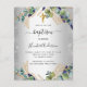 Um fundo de aparência pura prateada decorado com verde de eucalipto e folhas de ouro e faíscas de brilho prateado. Uma cruz ouro. Personalize e o nome e a cerimônia da criança.