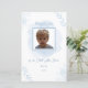 Celebre o dia especial do seu filho com este Menu do batismo refinado. Apresentando uma borda floral azul serena e um fundo de aquarela suave, este design transmite uma sensação de paz e espiritualidade. A peça central é a foto do seu filho, enquadrada lindamente com linhas limpas, enquanto o texto é apresentado elegantemente numa mistura de fontes clássicas de serifa e de scripts modernos. Perfeito para os pais que procuram um eterno e um convite sincero para marcar esta ocasião sagrada. B007