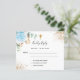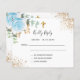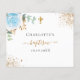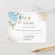 Um fundo branco decorado com um verde de eucalipto, um floral azul de cor aquosa, folhas de ouro e gotas de ouro falso. Voltar: Personalizar e o nome dos filhos e a data da cerimônia