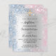 Um batismo moderno e elegante, celebrando dois bebês, uma menina e um menino. Fundo metálico de aspecto fino prateado decorado com faíscas brilhantes azuis e cor-de-rosa e com uma cruz ouro. Personalize e adicione nomes e detalhes da cerimônia. Letras pretas coloridas.